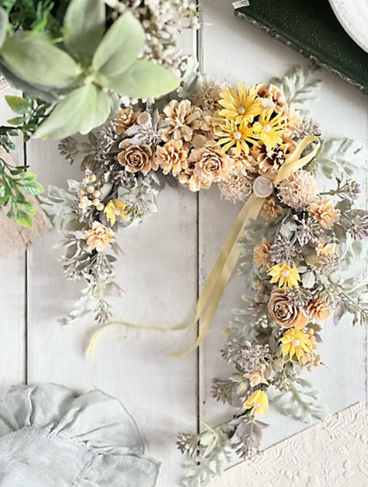 柔らかな柔らかな色合いのアーティフィシャルリーフをたっぷりと重ね、ミモザカラーが冬の白い空気に春の光を映します。上質な素材で描く、軽やかでエレガントな壁飾りです。